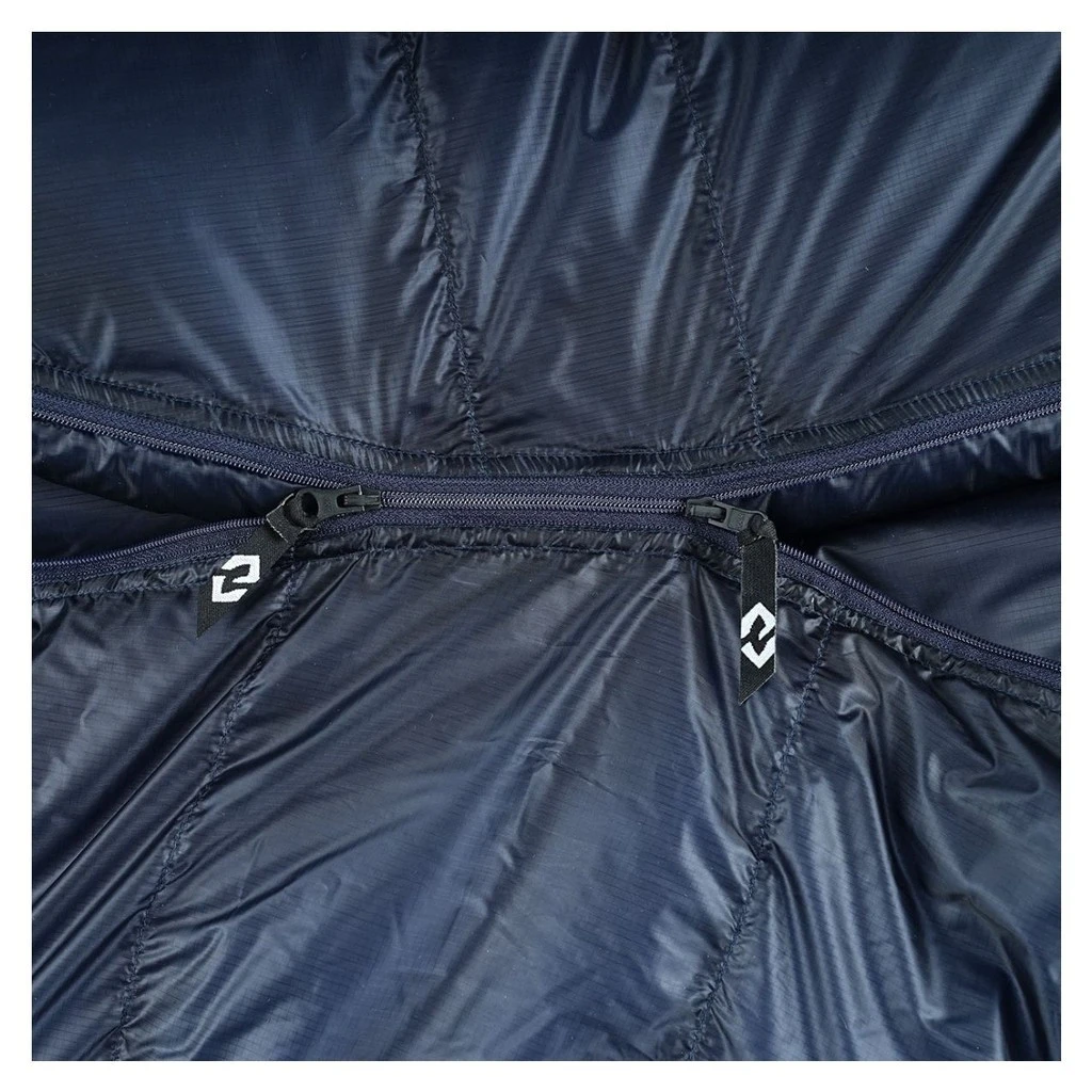 Ce sac de couchage minimaliste dispose dâun zip 2/3 YKK double curseur et dâune capuche enveloppante avec sangle de serrage.