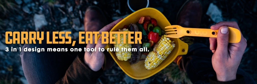 L’Utility Spork d’UCO est un pack de 2 couverts 3-en- 1 qui réunit les 3 fonctions essentielles pour pouvoir manger : cuillère-fourchette-couteau.