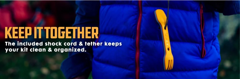 Deux trous situés sur le manche de l’Utility Spork permettent de la fixer sur le cordon fournit à cet effet. Ceci permet de l’accrocher pour la faire sécher ou de la transporter sans risque de perte.